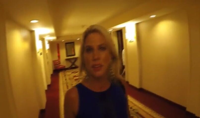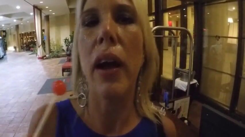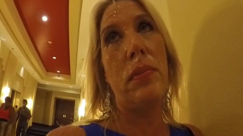 Mature blonde sprayed the face with cum and for even a little more tingling, she wants to run through the hotel with the cum on her face.