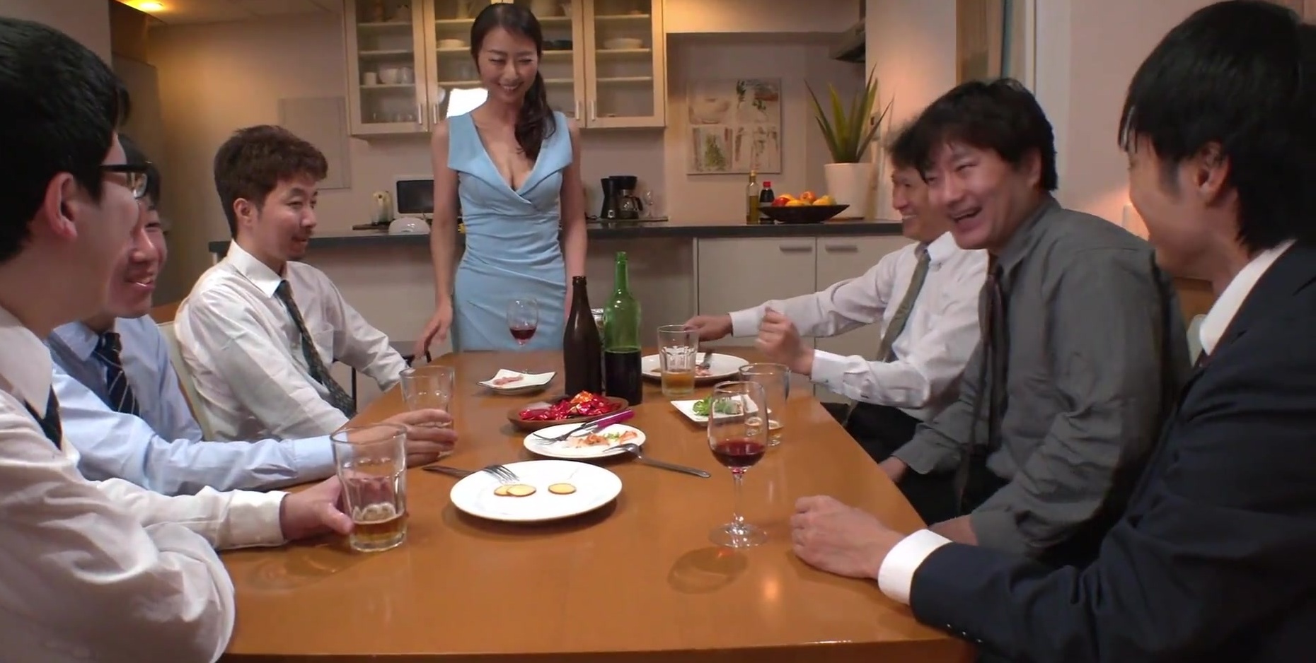 The dinner at a work colleague's house was a nice end for the guests, the pretty, busty hostess was harassed by several men and undressed. They wanted some more love and sex for dessert.